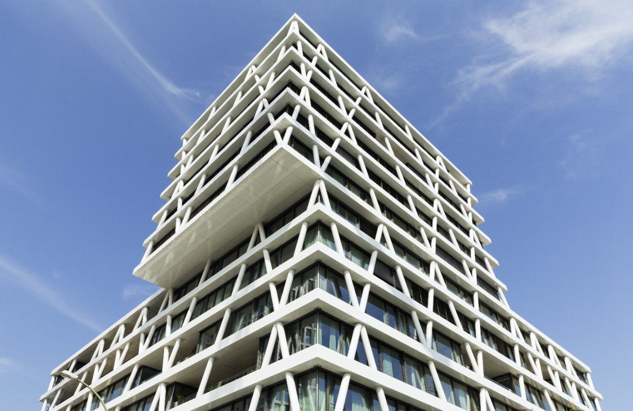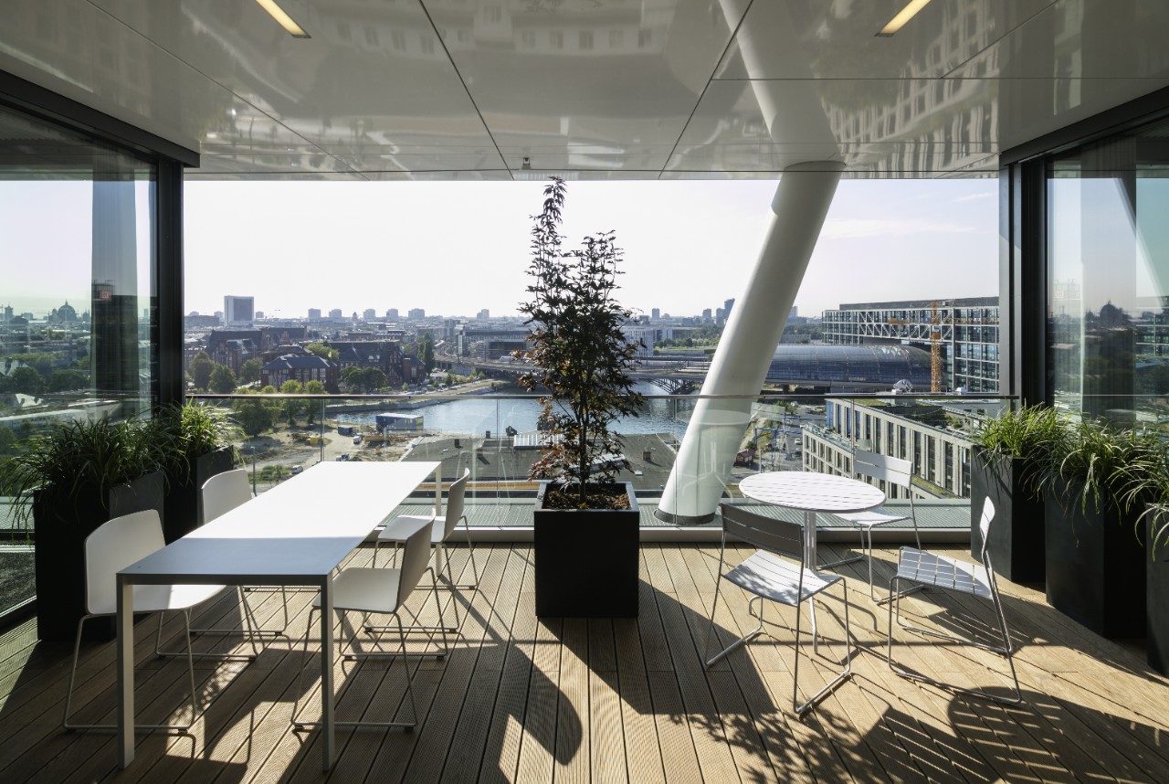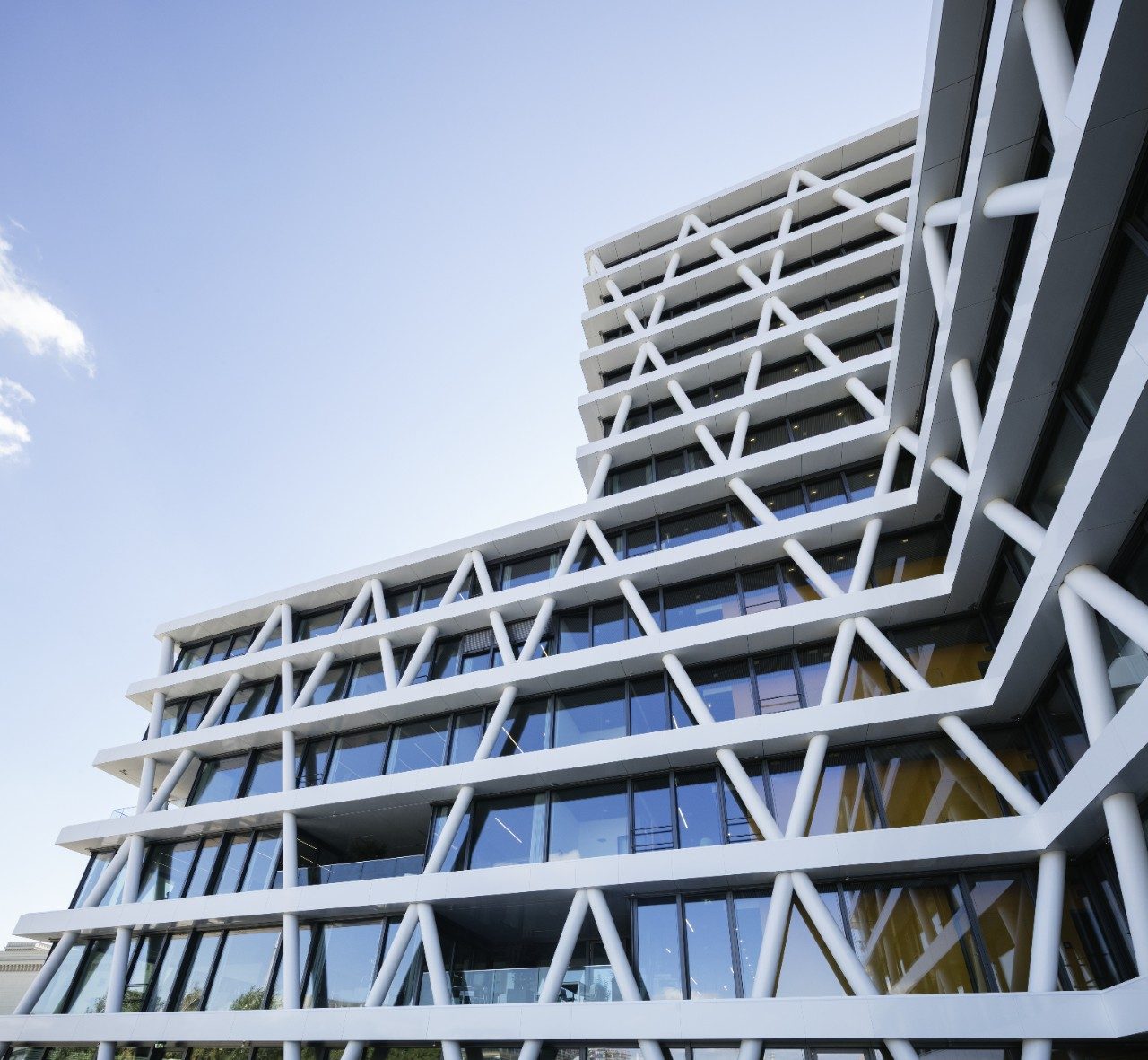 Budova se architektonicky prezentuje jako překrytí tří různých konstrukcí: horizontální podlaží, vnější síťová struktura a vnitřní oranžová jádra. Každé podlaží nabízí jako venkovní prostory několik balkónů, které lze využít jako pracovní prostory nebo místo pro odpočinek a relaxaci. Vnější nosná konstrukce je vyrobena z bílých ocelových kompozitních sloupků, které umožňují vnitřní prostory podél skleněné fasády bez sloupků, a tedy flexibilní využití interiéru. V noci jsou jednotlivé podpůrné segmenty vnější konstrukce osvětleny, což vytváří dynamické čáry, které připomínají sinusové křivky.