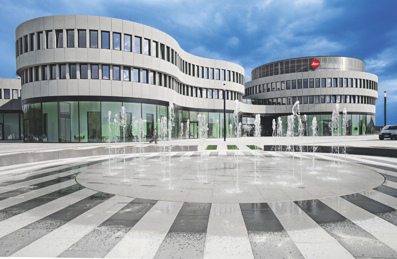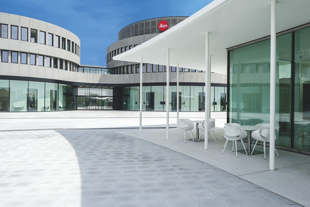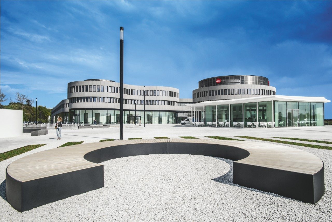 Zakřivená fasáda centrály se značně podobá řadě objektivů pro fotoaparáty. Hlavní vstup do budovy tvoří dvě válcovité konstrukce – kruhové segmenty pokračují uvnitř a automaticky navozují spojení s objektivy Leica a prstencovými produkty.