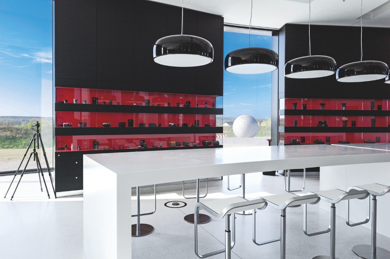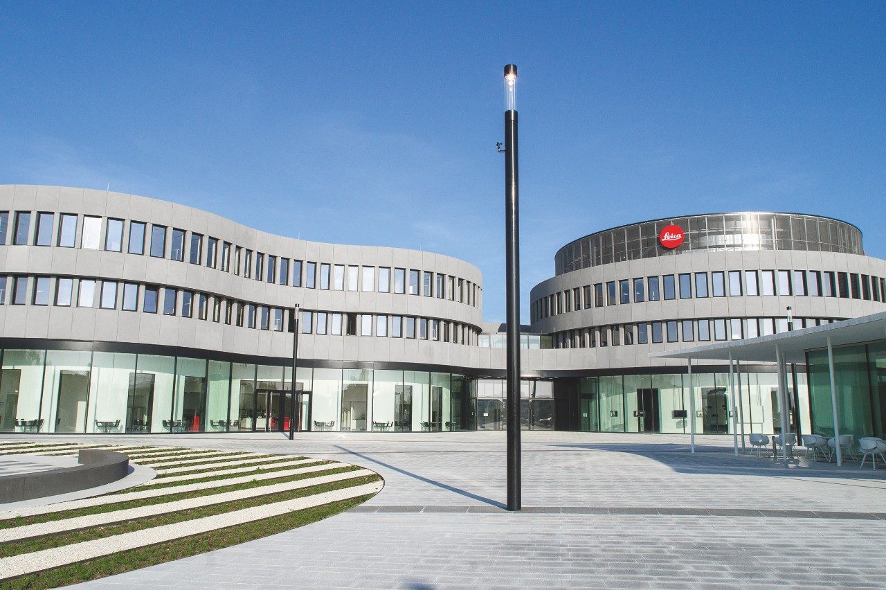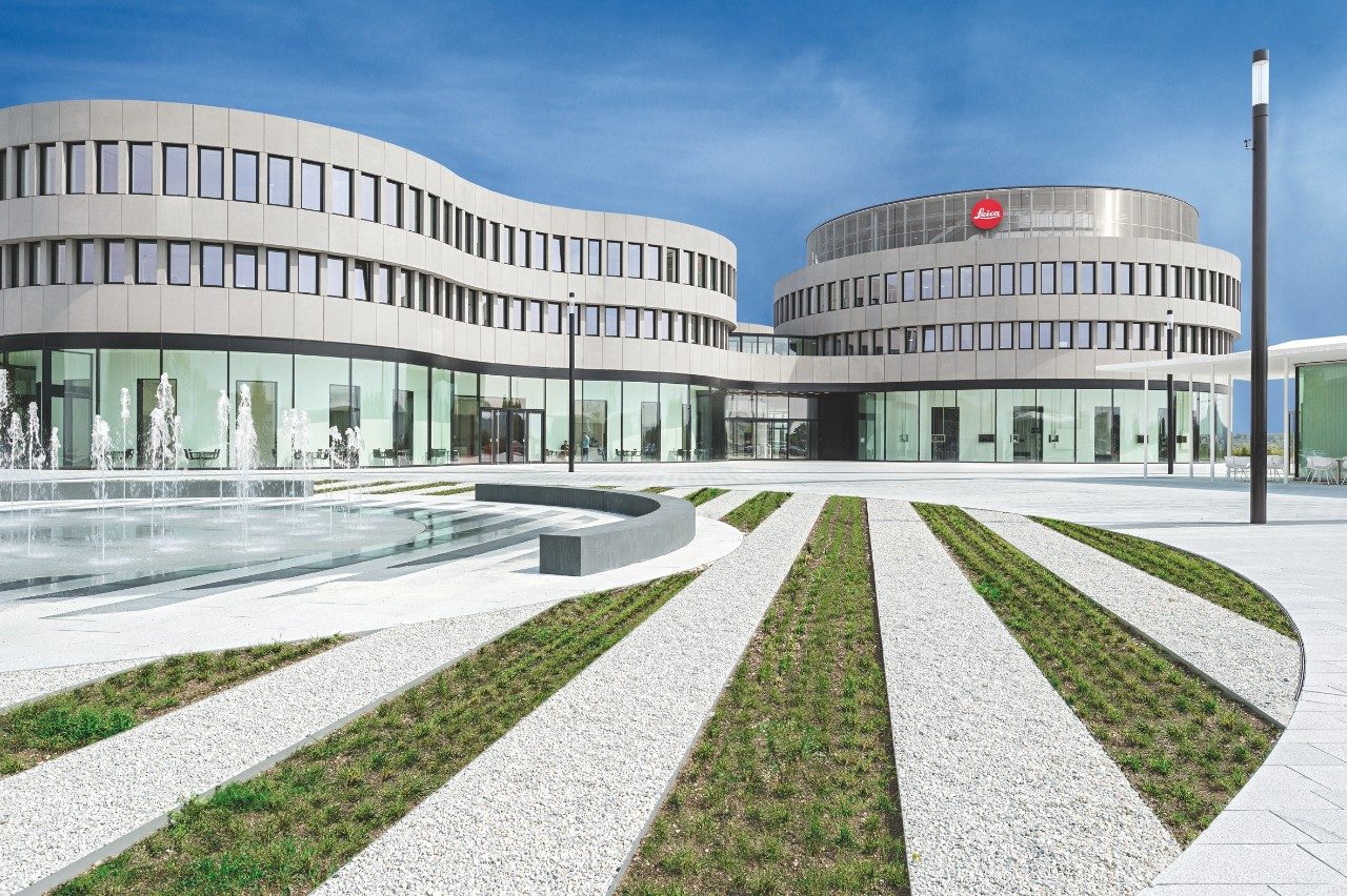 Zakřivená fasáda centrály se značně podobá řadě objektivů pro fotoaparáty. Hlavní vstup do budovy tvoří dvě válcovité konstrukce – kruhové segmenty pokračují uvnitř a automaticky navozují spojení s objektivy Leica a prstencovými produkty.