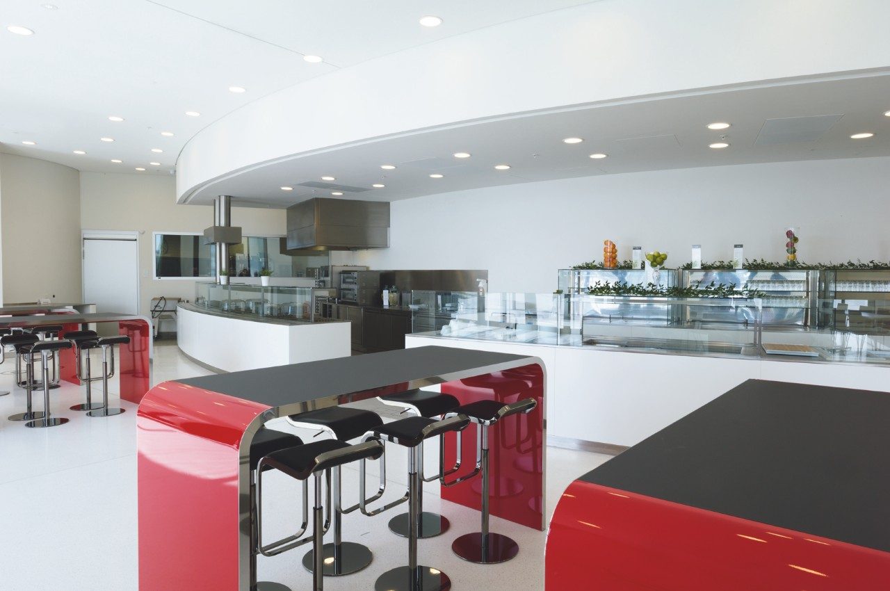 Částečně zakřivená skleněná fasáda na přízemí ční do výšky zhruba 5 metrů a probíhá kolem celé stavby, a nabízí tak procházejícím úchvatné pohledy do budovy.