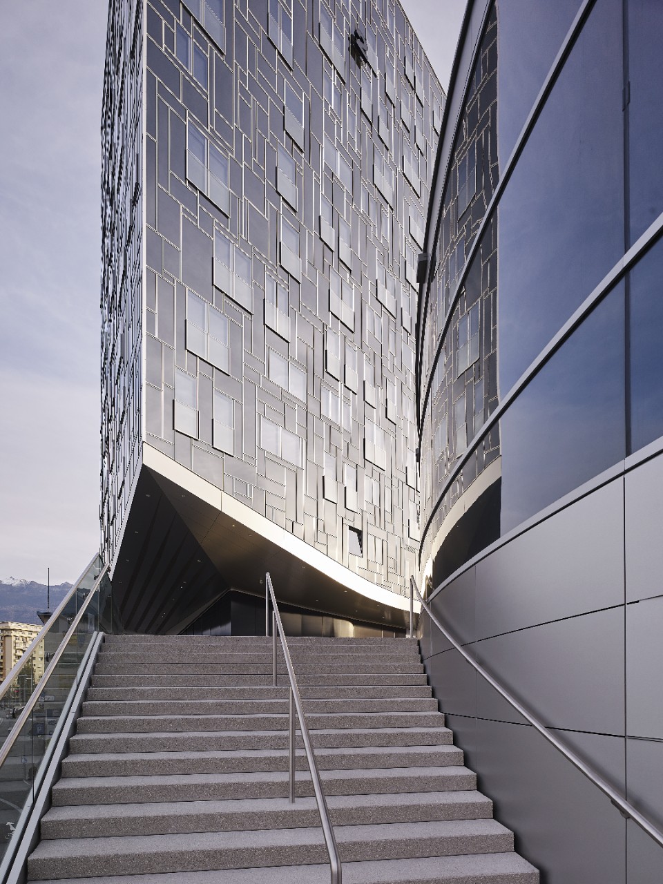 A 3XN építésziroda szándékos geometriai transzformációkkal alkotta meg a háromszögletű felületi domborművek prizmaszerű mintázatát.