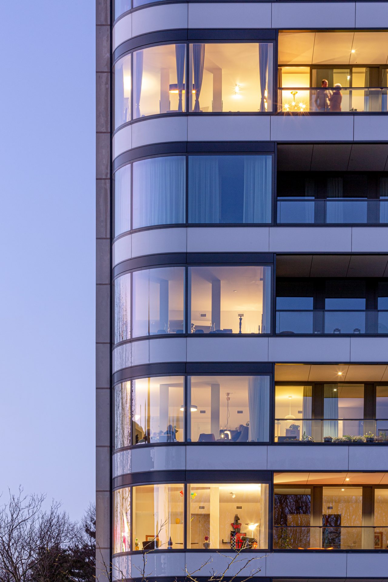 Een belangrijk onderdeel van de herontwikkeling zijn de hoge stroken glas en de stroken wit geëmailleerd veiligheidsglas, die het modernistische karakter van het bestaande gebouw respecteren, maar tegelijkertijd het nieuwe woonhuis een aantrekkelijke uitstraling geven.