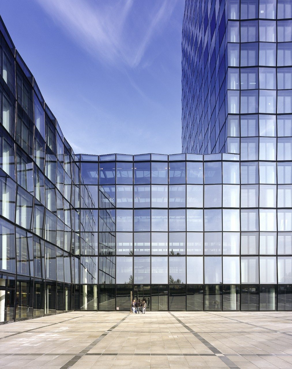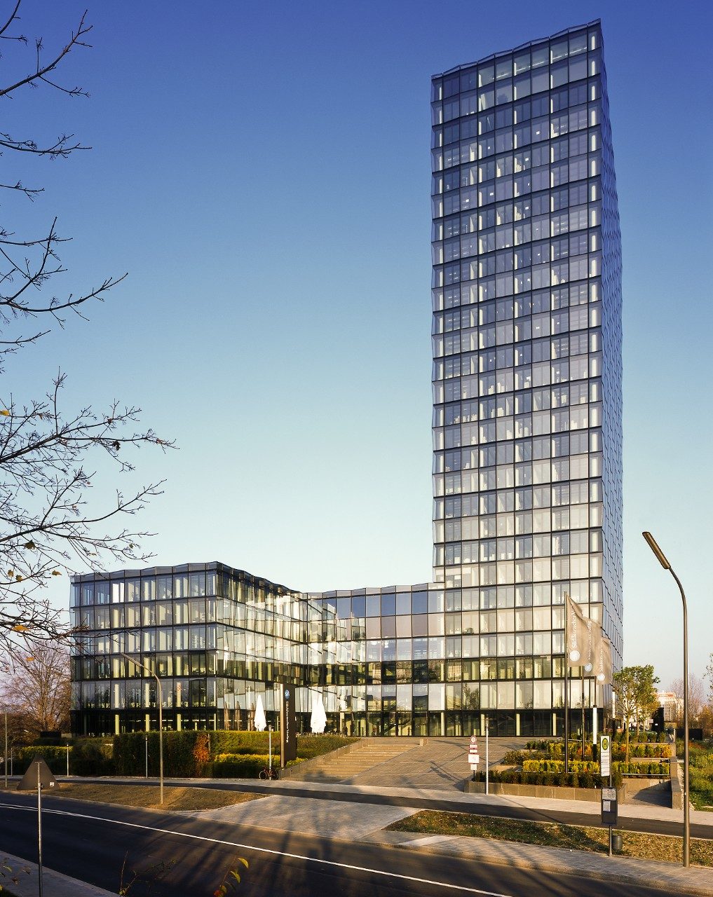 Conceptul se bazează pe caracteristicile de design ale modernismului clasic: claritate și abstractizare, precum și o dezvoltare asimetrică lucidă a dominantelor orizontale și verticale. Cu o înălțime de aproape 100 de metri, această clădire foarte zveltă este conectată integral cu ajutorul unei bare dispuse de-a lungul a șase etaje, care avansează deasupra unui atrium transparent, la fel de prestigios. Fațadele longitudinale prismatice reflectă ingenios peisajul și cerul.