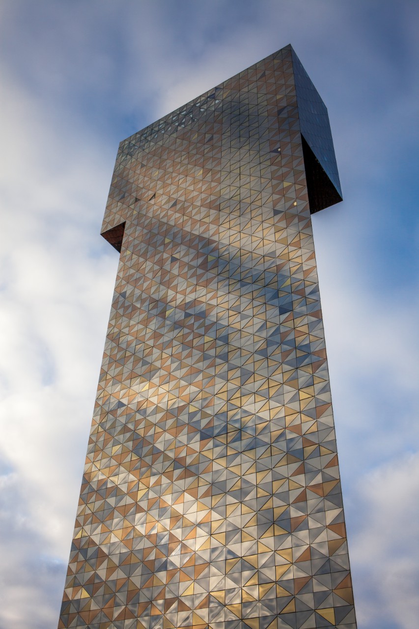 Forma de paralelogram a turnului este completată de un cuboid dreptunghiular care permite etajelor superioare să se suprapună peste forma principală a clădirii, subliniind geometria acesteia. Fațada teselată a clădirii este îmbrăcată în întregime în sticlă colorată, un aranjament neregulat de geamuri triunghiulare colorate care conferă fațadei caracterul său unic.